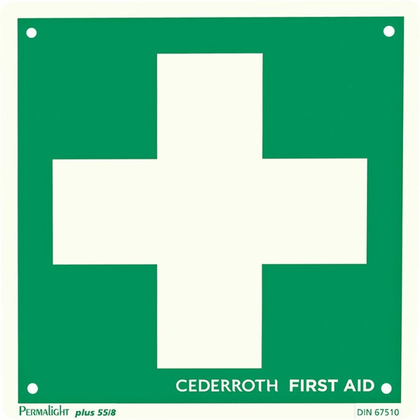 Efterlysande varselskylt ”Första Hjälpen” i hårdplast som lyser i mörkret efter uppladdning i dagsljus eller annan ljuskälla. Dubbelsidig för montering som flaggskylt eller hängande från taket.