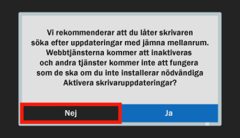6.    En popup kommer att dyka upp med frågan “Vill du sätta på skrivaruppdateringar?” / “Do you want to turn on printer updates?”.